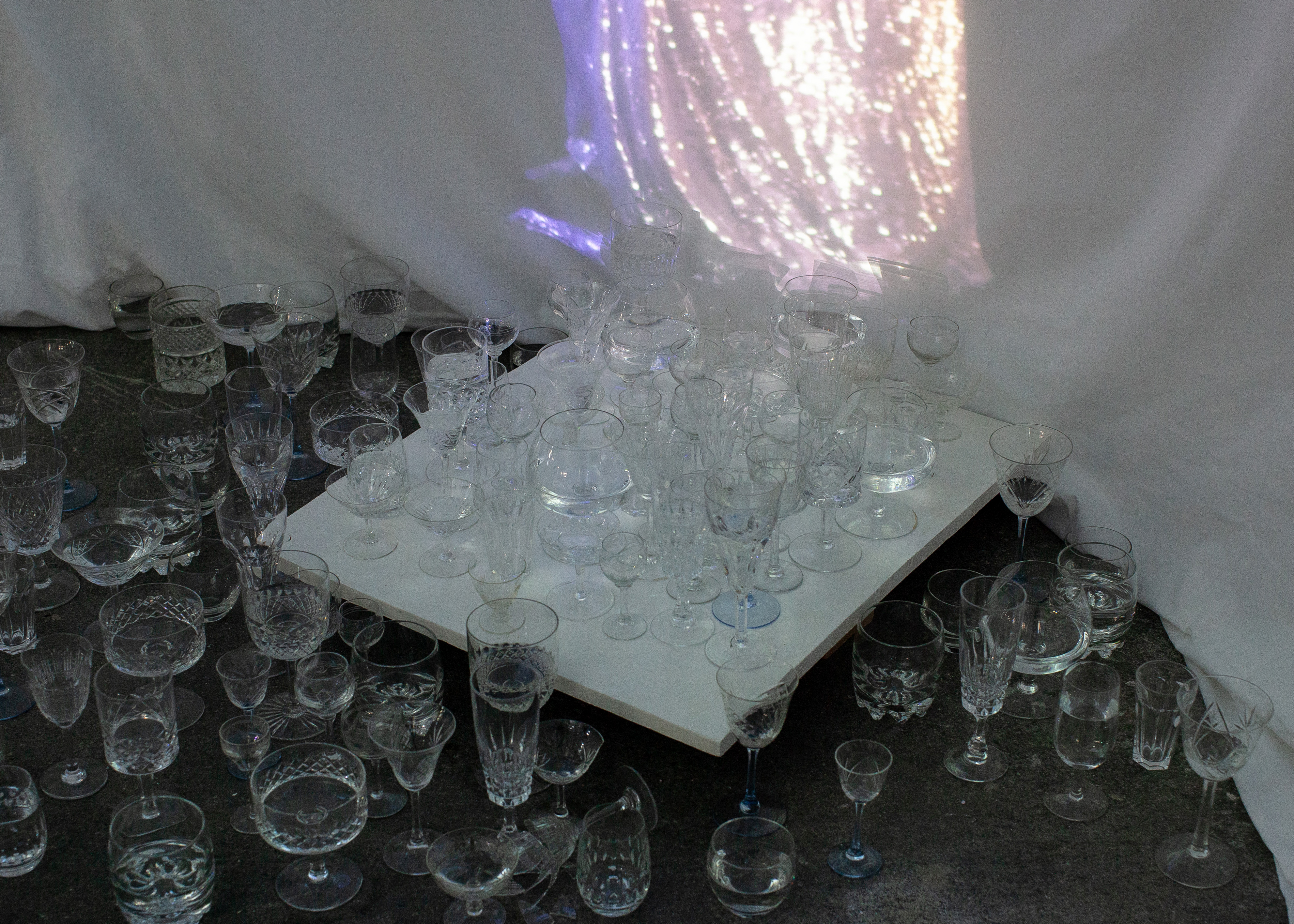 Video projection on curtain, crystal glasses, vibrating sound piece, wooden board